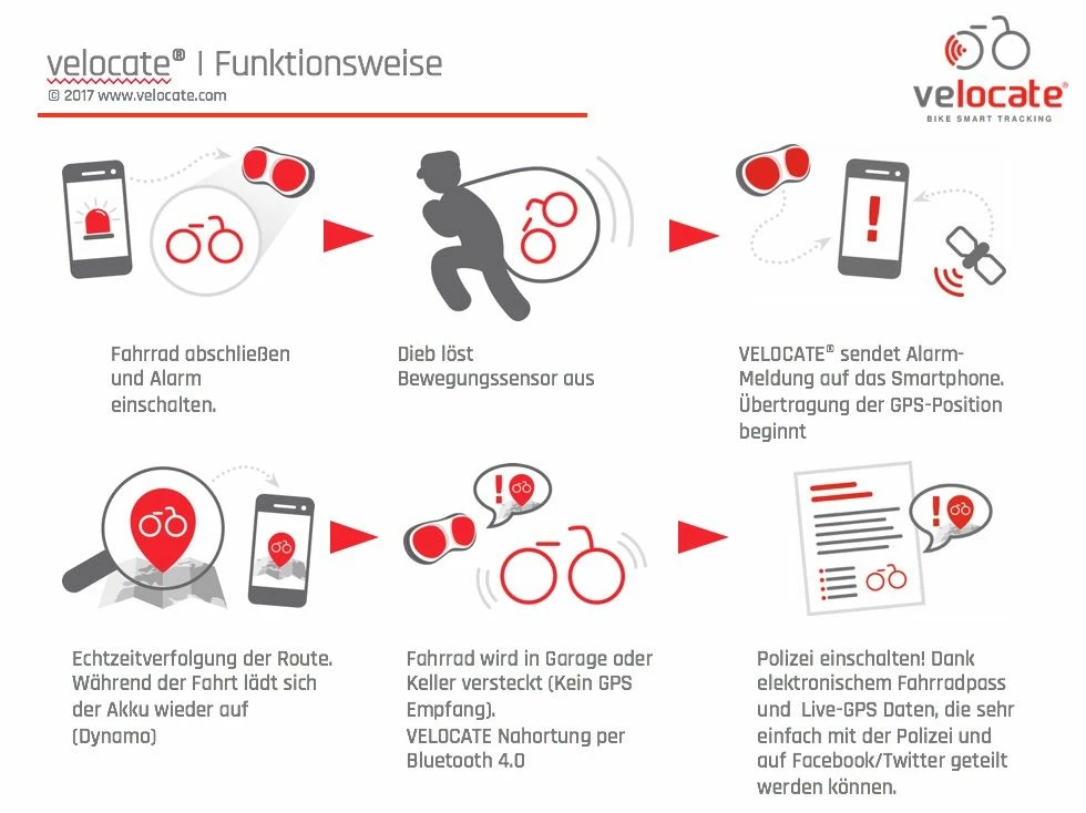 Grâce à un tracker GPS intégré, le feu arrière Velocate VC|one est un système de localisation fiable pour les vélos électriques volés. L’application pour smartphone « Velocate GPS » permet de relier et d’activer le tracker.